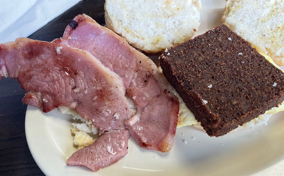 Shelby has a livermush festival in October, on the 18th this year. Natalie Ramsey of Red Bridges will be one of the judges. Am I doing anything that weekend? Marion, just over a couple of mountains, also has a festival in June. Hmmm. I was excited to have a livermush biscuit in Shelby and, of course, a country ham biscuit. Here they are.